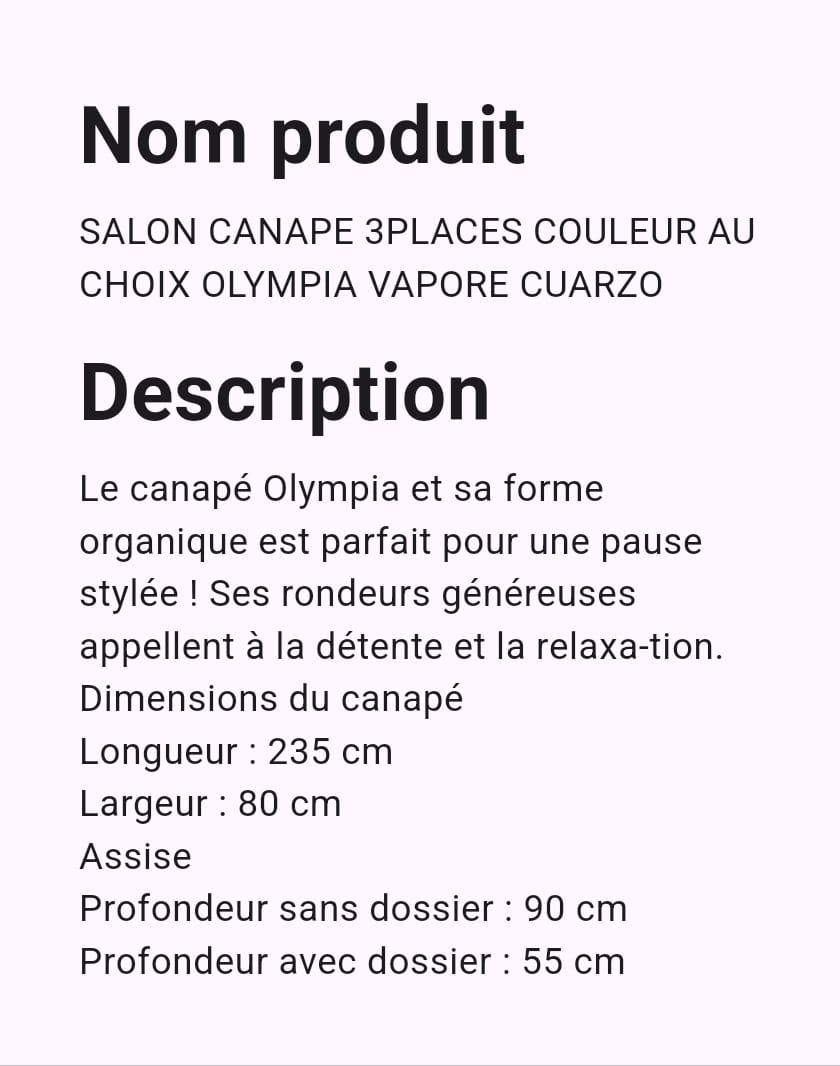 SALON CANAPE 3 PLACES COULEURS AU CHOIX OLYMPIA VAPORE CUARZO